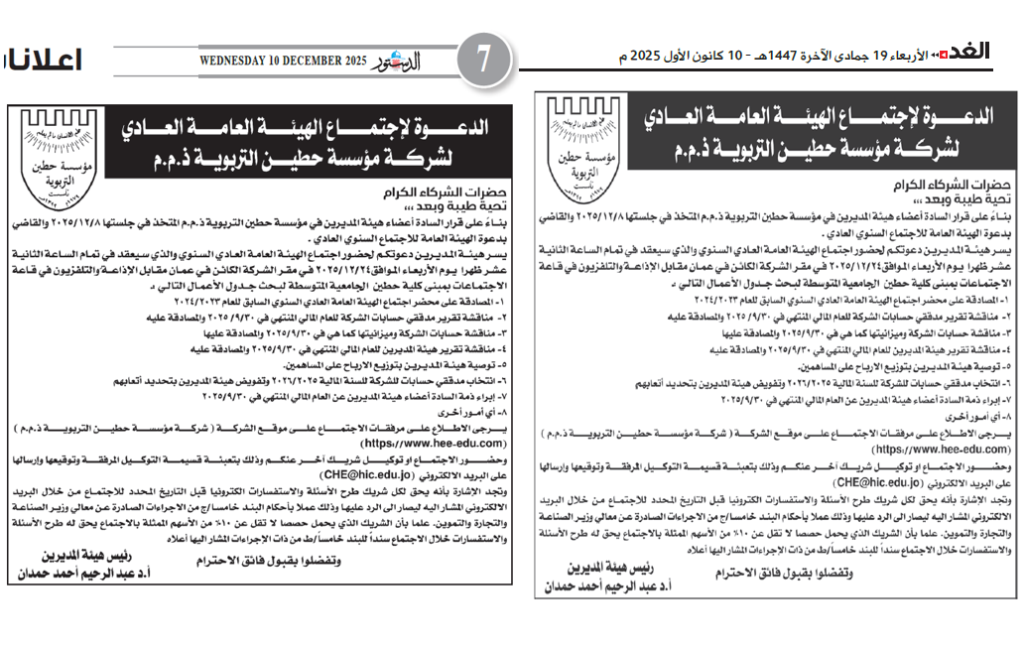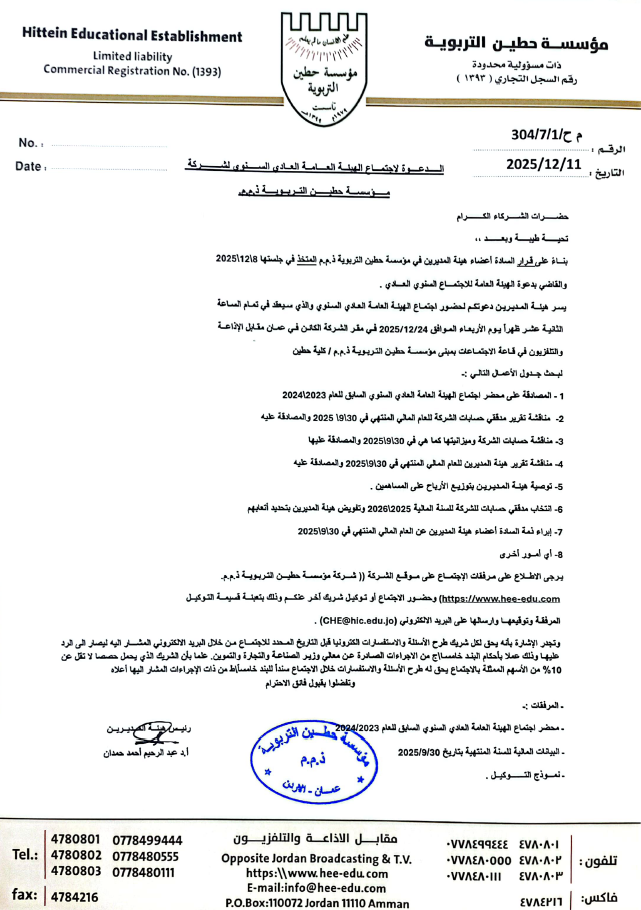 اجتماعات الهيئة العامة العادي وغير عادي الدعوة لاجتماع الهيئة العامة العادي السنوي لشركة مؤسسة حطين التربوية ذ.م.م الدعوة لاجتماع الهيئة العامة العادي السنوي لشركة مؤسسة حطين التربوية. نموذج التوكيل ميزانية شركة مؤسسة حطين التربوية 2020 تقـــــــــــريـــــــــــــر هيئــــــــــــة المـــــــديــــــــــــريــــــــــــــن للفتــــرة من 1/10/2019 - 30/9/2020 الدعوة لاجتماع الهيئة العامة العادي لشركة مؤسسة حطين التربوية ذ.م.م. للعام ٢٠٢٠/٢٠٢١ التوكيل جدول الاعمال الحساب الختامي للعام المالي ٢٠٢٠/٢٠٢١ تقرير هيئة مديري مؤسسة حطين التربوية للعام الاكاديمي ٢٠٢٠/٢٠٢١ الدعوة لاجتماع الهيئة العامة العادي لشركة مؤسسة حطين التربوية ذ.م.م الدعوة التوكيل محضر اجتماع الهيئة العامة العادي شركة مؤسسة حطين التربوية ذ.م.م / عمان 08/01/2023 جدول اعمال التوكيل الحساب الختامي للعام المالي 2021/2022 محضر اجتماع الهيئة العامة العادي شركة مؤسسة حطين التربوية ذ.م.م / عمان 08/01/2023 تقرير هيئة المديرين للفترة من 01/10/2021 - 30/09/2022 دعوة لاجتماع الهيئة العامة غير العادي لشركة مؤسسة حطين التربوية ذ.م.م التوكيل الدعوة اعلان صادر عن هيئة مديري مؤسسة حطين التربوية بتوزيع الارباح على السادة المساهمين اعلان الدعوة بالجريدة الرسمية الدعوة لإجتماع الهيئة العامة السنوي العادي للعام ٢٠٢٣/٢٠٢٢ جدول أعمال اجتماع الهيئة العامة العادي لشركة مؤسسة حطين التربوية ذ.م.م للعام 2023/2022 الدعوة لاجتماع الهيئة العامة العادي لشركة مؤسسة حطين التربوية ذ.م.م نموذج التوكيل لحضور اجتماع الهيئة العامة السنوي العادي للعام 2022/2023 محضر الهيئة العامة العادي السنوي للعام 2021/2022 انقر هنا لتحميل المحضر ميزانية شركة مؤسسة حطين التربوية. ذ. م.م. للعام المالي 2022/2023 انقر هنا لتحميل الميزانية تقرير هيئة المديرين للهيئة العامة العادي السنوي للعام 2022/2023 صفحة رقم 1صفحة رقم 2صفحة رقم 3 انقر هنا لتحميل التقرير بصيغة ال PDF الدعوة لاجتماع الهيئة العامة العادي السنوي لشركة مؤسسة حطين التربوية ذ.م.م جدول أعمال اجتماع الهيئة العامة العادي السنوي لشركة مؤسسة حطين التربوية ذ.م.م للعام 2024/2023 نموذج التوكيل لحضور اجتماع الهيئة العامة السنوي العادي للعام 2024/2023 أنقر هنا لتحميل نموذج التوكيل بصيغة pDF الحساب الختامي للعام المالي 2024/2023 انقر هنا لتحميل الحساب الختامي بصيغة PDF اعلان الدعوة بالجريدة الرسمية محضر اجتماع الهيئة العامة العادي شركة مؤسسة حطين التربوية ذ.م.م / عمان 2023/12/23 محضر اجتماع الهيئة العامة العادي (السنوي) تقرير هيئة المديرين للفترة من 2023/10/01 - 2024/09/30 اعلان صادر عن شركة مؤسسة حطين التربوية ذ.م.م الدعوة لاجتماع الهيئة العامة الغير عادي لشركة مؤسسة حطين التربوية ذ.م.م نعي وجيه فاضل